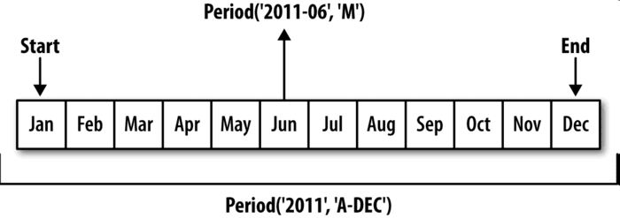 时期(period)表示的是时间区间,比如数日、数月、数季、数年等。