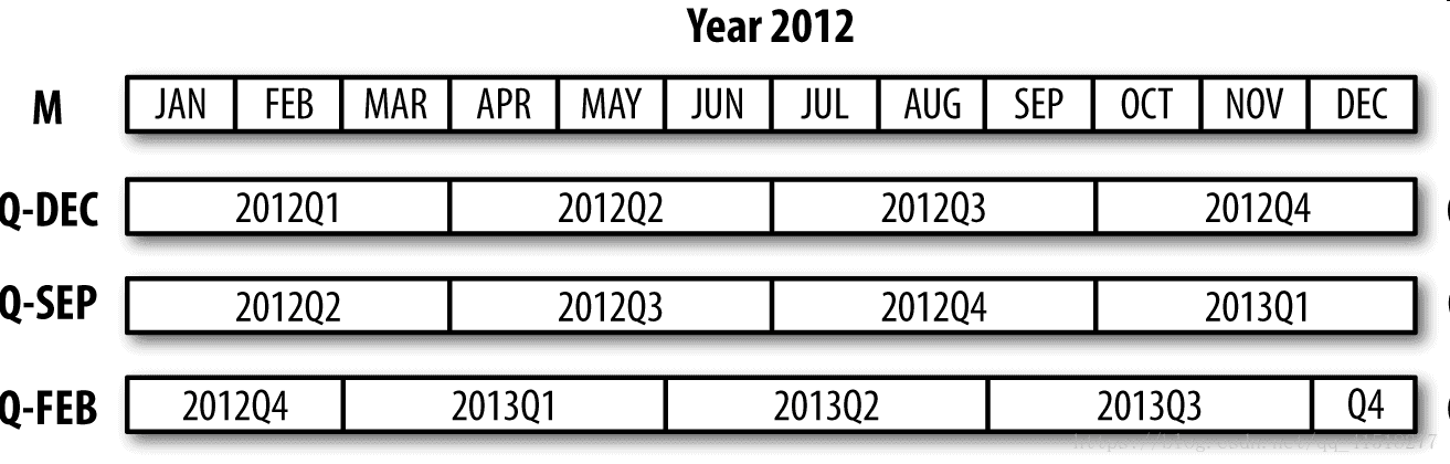 | Q-JAN,Q-FEB,… | QuarterEnd | 以指定月份(最后一个日历日)结束季度 |