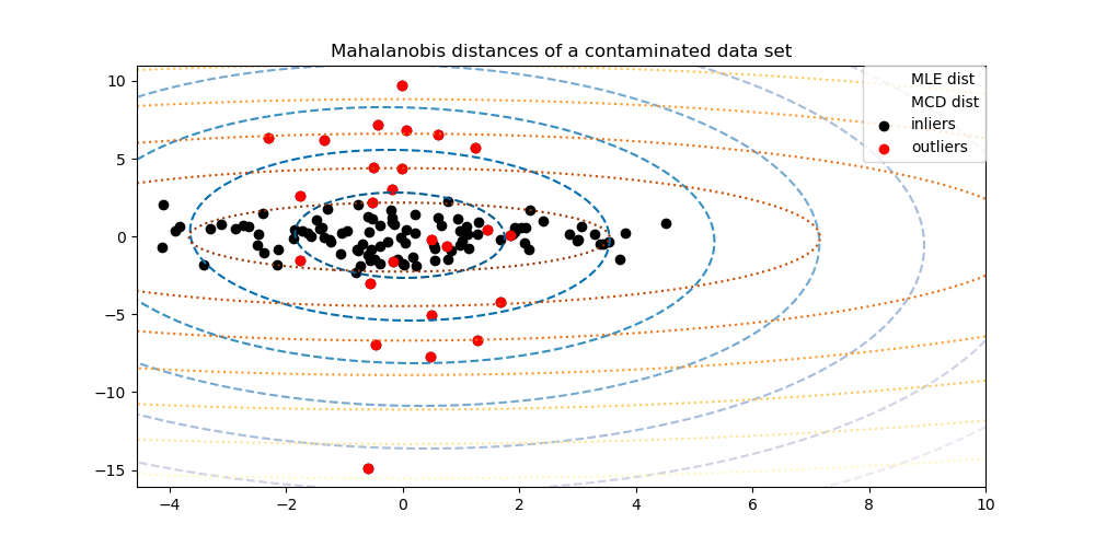 椭圆包络(Elliptic Envelope)算法假设数据为正态分布,并基于这个假设对数据进行稳健的协方差估计(Robust covariance),从而为中心数据点拟合出一个忽视了离群点的椭圆。从而使用 Mahalanobis 距离进行异常检测。 该策略如下图所示