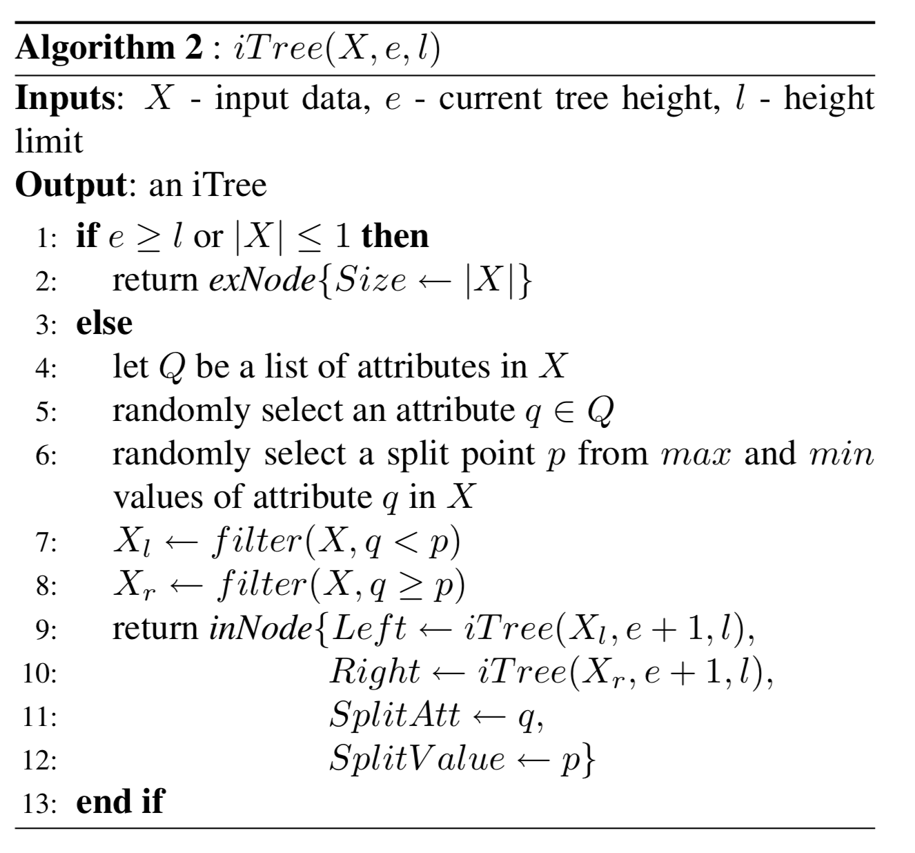 在做 iTree 分裂决策时,由于我们没有目标变量,所以没法根据信息增益或基尼指数来生成树。iTree 使用的是随机选择划分特征,然后在这个特征的范围内再随机选择划分阈值,对树进行二叉分裂。直到树的深度达到限定阈值或者样本数只剩一个。
