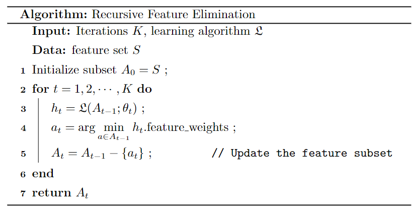 递归特征消除:(recursive feature elimination,RFE)使用一个基模型(通常用于支持向量机)来进行多轮训练来选择特征。首先,预测模型在原始特征上训练,每项特征指定一个权重。然后,从当前的特征集合中移除最不重要的特征。在特征集合上不断的重复递归这个步骤,直到最终达到所需要的特征数量为止。