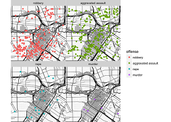 ggmap可以轻松地从流行的在线地图服务(如Google Maps, OpenStreetMap,Stamen Maps)获得地图图块,并使用ggplot2绘制静态地图。